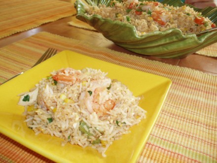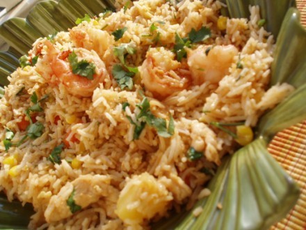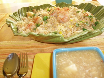 | Обычно я делаю просто с куринными сосисками,а вчера у меня еще остались креветки и 1 куриная грудка,так что получился combination fried rice.:-))) Жареный рис с Тайскими нотками. ![]() ![]() 1 чашка риса,отварить. ~200 гр. креветок больших ~200 гр. куриных грудок,порезаных тонкими полосочками ~100 смеси замороженых овощей(стручковая зеленая фасоль,кукуруза,горошек,морковка или что вам хочется,но без сладкого перца) ~100гр консервированых ананасов 2 ст.л. соевого соуса(по желанию,по идее он здесь не нужен но мы любим поэтому я добавляю) 1 ст.л. рыбного cоуса 3 ст.л. арахисового масла. 1 ст.л. сладкого чилли соуса 2 яйца Пучочек кинзы,порезать Нагреть сковороду и добавить арахисовое масло(1 ст.л.),когда оно нагрелось бросили курицу и помешивая обжарили пару минут.Добавили креветки,мешая обжариваем в с курицей до гоовности(ну или почти).Добавляем наши овощи,прям как есть замороженые,пару минут обжарили и сюда же добавили ананас.Ложкой сгрести мясо с овощами в строну,а на освободившееся место разбить яйца и мешая обжарить их.Теперь добавили свареный рис(или если у вас остался со вчерашнего дня в холодильнике готовый рис) и все перемешали,добавили все соусы(больше/меньше на ваш вкус) + 2 ст.л. арахисового масла.Обжарили все вместе минуты 2-3,чтобы все хорошо прогрелось.Посыпали кинзой. Усе. |