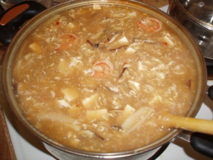 | Во-вторых... Как насчет покушать? У нас сегодня Свинина Адобо ( из филипинской кухни.Найден рецептик когда-то на сетке,слегка переделан под мой вкус) ![]() ![]() 2-3 фунта свинины (~1.4 кг) 6-10 долек чеснока (через чеснокодавку) 1 ст. л. черного перца(mozhno po vkusu) 4 ст. л. соевого соуса (я лю чуть больше) 1/2 чашки уксуса обычного белого 3 чашки воды 1 луковица (сегодня я пользовала луковый порошок ,потому что лука не было,притрусила немножко,может 1 ч. л.?) 2-3 лавровых листа 2 ст. л. крахмала (можно без) масло раст. немножко для обжарки мяса Мяско порезали кубиками ili poloskami,на сковороде разогрели масло и обжарили на нем свининку до коричневости.Переложили в кастрюльку (можно и в сковороде если есть крышка для нее)и добавили все ингридиенты кроме крахмала. Тушится мяско до мягкости,у меня минут 40. В конце (можно и не добавлять,я добавляю) растворяем крахмал в водичке(чуть-чуть воды) и вмешиваем его в наше мяско. Подаем или с рисом (как я) или с вермишелью. ![]() ПС: кол-во уксуса можно регулировать больше/меньше,как вам нравится.Пол стакана для нас в самый раз ,просто я беру чуть больше соевого соуса. Так же,хотелось чего-то такого необычного,чего-то с фруктовым оттенком,чтобы оттеняло вкус мяска.Полезла я в холодильник и обнаружила там.... (продолжение следует) |