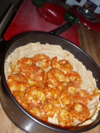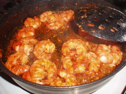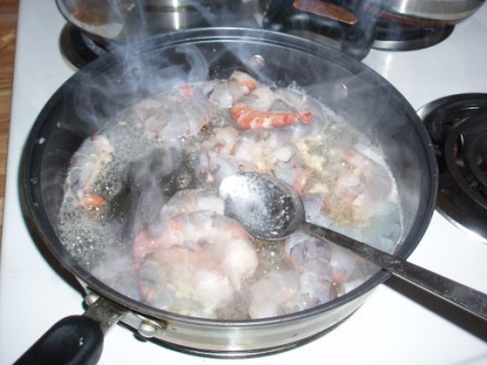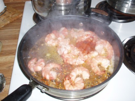 4 ст.л. оливкового масла(я взяла 2) 4 ст.л. сливочного масла(я взяла 2) 1 1/2 фунта креветок,очищеных(примерно 750-800 гр) 1 зубок чеснока,через чеснокодавку 2 ст.л. лимонного сока 1 ч.л. паприки 1/2 ч.л. хлопьев красного перца