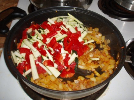 1 средний лук,нарезать 1 зубок чеснока,измельчить 1 чашка зеленой стручковой фасоли,концы обрезать и разрезать пополам(я вместо фасили использовала 1 среднюю зукини(нарезала полосочками),так как муж не есть зеленую фасоль-получилось супер) 1 красный перец,нарезать кубиками