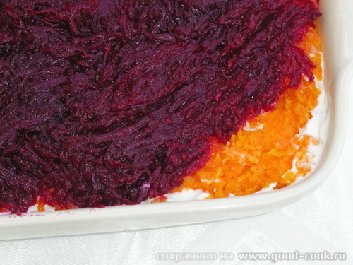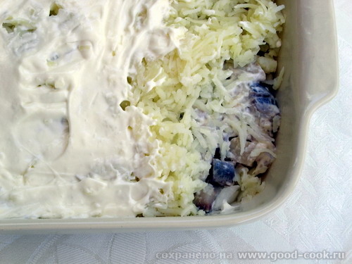 Овощи и яйца отварить, свеклу варим отдельно. Разделать филе - порезать на кубики, удалить лишние косточки, перемешать с ложкой майонеза и оставить промариноваться. Луковицу почистить и порезать на тоненькие кубики. Промыть в холодной воде, дать стечь воде, можно промокнуть салфеткой. Овощи почистить от шкурки, яйца почистить от скорлупы. На плоское блюдо с бортиками выкладываем резаный лук, затем промаринованную селедку, сверху трем на МЕЛКОЙ терке картофелины и аккуратно расправляем тертый картофель вилочкой по всей поверхности. Ложкой накладываем майонез, второй ложкой аккуратно размазываем его по поверхности.