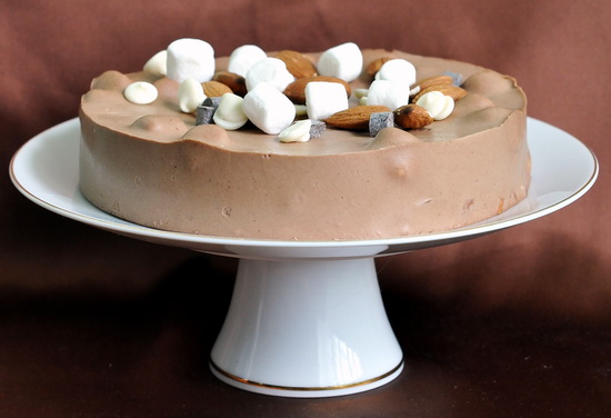 ![]() *оригинал 2 порции Сначала напишу мои комментарии. Если вы любитель сладкого, то увеличьте количество сахарной пудры. В оригинале берётся листовой желатин. Я использовала порошковый. По рекомендациям по замене пластин желатина на порошок, пользовалась следующими пропорциями: 1 пластина = 1 ч ложка порошка. Мусс получился очень плотным, поэтому количество желатина нужно уменьшить. Рецепт пишу с исправленным количеством желатина! 200 мл густых сливок 50 г чёрного шоколада 3 ч ложки желатина 100 мл молока 1 ст ложка сахарной пудры 15 шт мини-маршмаллоу 2 ст ложки белого шоколада в виде капелек 2 ст ложки черного шоколада в виде капелек 2 ст ложки рубленного миндаля Для украшения: 5-7 шт мини-маршмаллоу 1 ч ложка белого шоколада в виде капелек 1 ч ложка черного шоколада в виде капелек 8-10 шт миндаля Чёрный шоколад растопить на водяной бане. Остудить до комнатной температуры. Желатин залить холодным молоком для набухания (8-10 мин) Холодные сливки взбить до мягких пиков. Аккуратно смешать с сахарной пудрой. Взбить до устойчивых пиков. Аккуратно смешать с растопленным шоколадом, чтоб сливки не осели. Желатин нагреть почти до кипения (не кипятить!), размешать до полного растворения. Остудить до комнатной температуры. В тёплый желатин добавить 1 ст ложку шоколадно-сливочной массы, перемешать и тонкой струйкой влить в оставшуюся шоколадную массу, аккуратно перемешивая. Аккуратно вмешать орехи, маршмаллоу и шоколадные капельки. Переложить мусс в разъёмную форму (диаметр 20 см). Убрать в холодильник до полного застывания. Снять кольцо и украсить орехами, маршмаллоу и шоколадными капельками. |