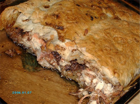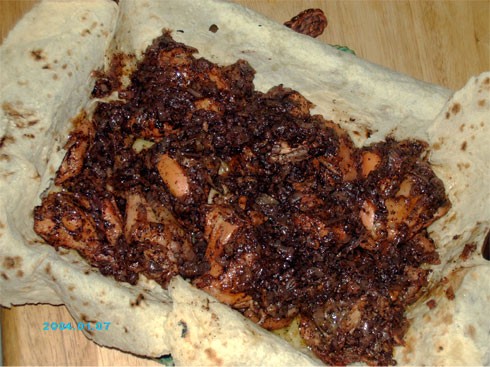 ![]() ![]() На фото видно, что я выстелила форму лавашом (форму смазать маслом, в котором жарилась курица, лаваш ложить в несколько слоёв, тоже можно слегка промазать маслом, даже можно добавить немного бульона - побрызгать лаваш), сверху курица с луком. Затем завернула края лаваша, смазала-сбрызнула водой и поставила в духовку запекаться. И вот результат - нежная, сочная курица с мягким соусом из лука, сумака и специй и тонкие, хрустящие слои лаваша. К этому блюду хорошо подойдёт салат из свежих овощей, зелень. |