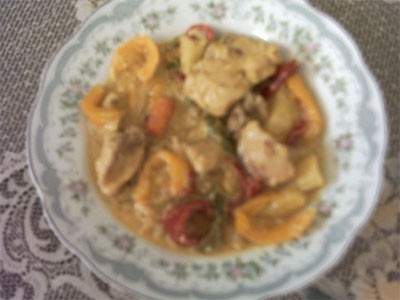 курица с цветным перцем и приправой карри 1 грудинку курицы 1 луковицу 1 болгарский перец красный 1 болгарский перец зелёный 1 болгарский перец жёлтый 2 ст.ложки карликовой моркови 2 средние картофелины 1 стк сливок(молока) 0.5 стк.сметаны 1 кубик магги 1 чайная ложка приправы карри соль,перец по вкусу *** лук нашинковать и выложить в кастрюлю,перцы болгарские тоже нарезать соломкой и высыпать сверху лука,и карликовую морковь и всё вместе обжарить на растительном масле,жарить минут 5,куриную грудинку нарезать кубиками,и выложить сверху затем обжарить слегка,картофель нарезать соломкой и обжарить отдельно,затем выложить сверху в кастрюлю, в блендере взбить сливки и сметану с кубиком магги,затем вылить сверху курицы ,посыпать приправами и тушить,до готовности. |