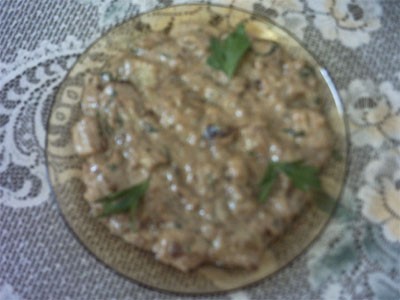 вот так я сделала Баклажан неженка 2 средних баклажана 1 маленькую луковицу 1 дольку чеснока немного зелени петрушки 1 стк.сливок или молока 2 кусочка сыра плавленого(весёлая бурёнка) масло оливковое для обжарки соль,1 кубик магги,1чайная ложка приправы карри,щепотка корицы *** лук нашинковать и обжарить совсем слегка на оливковом масле,баклажан очистить и нарезать на кубики размером в 1-2 см.и выложить сверху лука,обжарить всё вместе постоянно помешивая на медленном огне,затем в миксере взбить 1 стк.сливок или молока с кубиком магги и сыром,затем вылить в баклажаны,посыпать солью,корицей и приправой карри,тушить постоянно помешивая ложкой,чтобы сыр не пригорел,посыпать сверху нашинкованной зелени петрушки и снять с огня. |