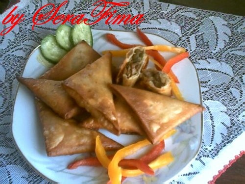 А у нас сегодня были сампусики. Хрустящие треугольнички с мясной начинкой. очень быстро и вкусно. начинка может быть любая, мясная, сыр фета с петрушкой, овощная - на любой вкус. Сампусик |