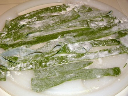 Главное, тесто пересыпать мукой, аккуратно сложить гармошкой и не слишком надавливать ножом при резке, нарезать полоски по 12-13 мм шириной ![]() Точно также пересыпать мукой и сложить на чистой ткани или полотенце. ![]() Рецепты с такими паппарделле дам. Можно их отваривать к Скорчащему мясу от Мани. |