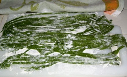 Если раскатываете вручную, то до желаемой вами толщины. ![]() и далее нарезать или фетуччини или спагетти ![]() 5. Пересыпать мукой и сложить на чистой ткани или полотенце. ![]() Спагетти рекомендуют закручивать в виде гнезд. Не знаю, мне так проще разложить их в таком виде. Я делаю на разделочных досках, потом прямо на них убираю в морозильную камеру на 3 часа. После этого перекладываю в п/э пакеты и хранить можно около 1-2 мес. (обычно, раньше надо новую порцию готовить). Проделать все снова с оставшимся тестом. |