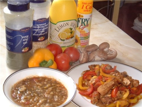 А я вот голодная прибежала с работы и быстро стряпала чего нибудь пожевать На столе суп со свежеи копусты (вчерашний) и stir fry с идюшкои и овошчами. Всё готовлено без жира. Уж очень постно всё у меня. Сегодня иду вешаться то есть взвешиваться. Попозже скажу сколько с меня слетело жира |