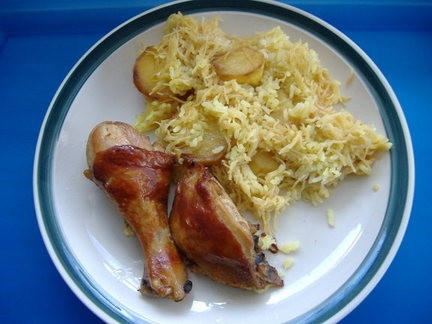 кока-кольную курицу с картошкой меня научили в Израиле делать,сначала укладываешь курицу,я добавляю еще соевого соуса и немножко вегеты,запекаю в духовке,когда курица немного приготовится,туда же добавляю крупно порезанную картошку и соль,запекаю до готовности,курица и картошка получаются красивого коричневого цвета,никакой сладости нет,как только появится у меня фотка,сразу поставлю. |
