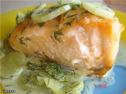 Ксюша, я к тебе с очередным спасибо!Очень вкусно, нежно, ароматно! Спасибо за рекламу!Филе лосося с огурцами и укропом! |