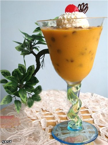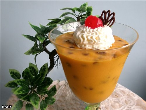 ![]() Для крема: 3-4 больших спелых манго 1 банка (400г) сгущенного молока 2 ч.л желатина 0,5 ст шоколадных чипсов ![]() - Манго почистить,срезать мякоть и прокрутить в блендере на большой скорости. - Затем протереть через мелкое ситочко.Это надо сделать обязательно, потому что манго очень волокнистый фрукт. - Еще раз прокрутить в блендере пюре из манго со сгущенным молоком и разведенным желатином. Поставить в холодильник на 20 мин. Потом вынуть и смешать с шоколадными чипсами. Разлить по десертным бокалам или десертным вазочкам. Поставить в холодильник ( лучше всего на всю ночь). Перед подачей украсить по вкусу. ![]() Приятного аппетита!!! |