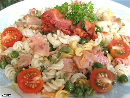 ПАСТА С ГОРОШКОМ И ВЕТЧИНОЙ ![]() 300 г пасты ( я брала разноцветную) 200 г зеленого горошка (свежего) 250 г ветчины (порезанной на кубики) 1 луковица (мелко порезанная) 2 зубочка чеснока (толченого) 4 ст.л сливок Соль,перец Тертый сыр (не обязательно) - Пасту отварить с небольшим добавлением растительного масла и соли (масло не дает ей склеиваться). - Горошек отварить до готовности. - На сковороде поджарить лук, ветчину. - Добавить горошек и сливки и потушить еще несколько минут. - Добавить 0,5 т воды и потушить на медленном огне пока соус не уварится до половины. - Добавить пасту в сковороду и все перемешать. - Посолить , поперчить. - Подавать сразу посыпав сверху тертым пармезаном или другим сыром по вкусу. Украсить по вкусу. Я украшала несколькими виточками пожаренного копченого бекона и помидорками черри. Приятного аппетита!!! |