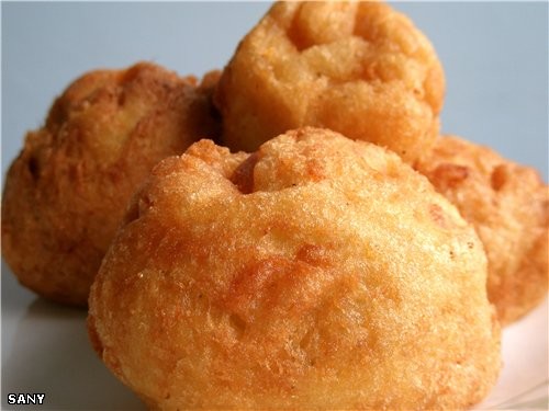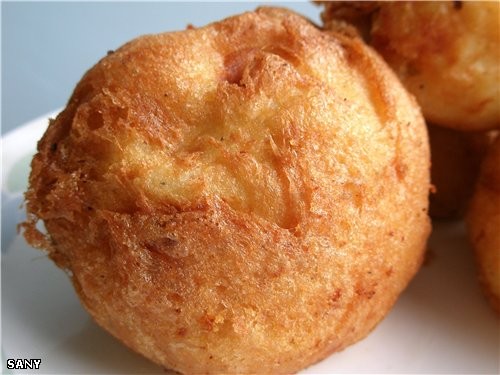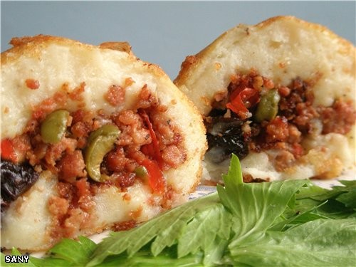 ФАРШИРОВАННАЯ КАРТОШКА ![]() ![]() Картофельное пюре (у меня было из 6-ти больших картошек) Соль, перец Щепотка мускатного ореха 1 яйцо 2 ст.л сухого молока Для начинки: 200 г молотого мяса (я брала половину говядины и половину свинины) 0,5 ст мелко нарезанного лука 1 зубочек чеснока ¼ ст мелко нарезанного красного болгарского перца 6 зеленых оливок мелко нарезанных 2 помидора без кожицы и семян порезанных на маленькие кубики 2 ст.л изюма 1/4 ст. сладкого вина ¼ ст. бульона ( я развела в горячей воде небольшой кусочек кубика «магги») Соль и перец по вкусу Кроме этого нам понадобится кляр «Орли» Приготовить картофельное пюре и смешать его со всеми другими ингредиентами.Должна получиться довольно плотная масса. Начинка: - Поджарить на небольшом огне лук , чеснок (толченый) и болгарский перец. - Выложить в сковородку молотое мясо и хорошо перемешать. - Добавить помидоры,оливки,изюм. - Залить все вином и бульоном и потушить на медленном огне до полного выкипания жидкости. Попробовать на вкус соль и перец и потушить еще немного,чтобы мясо чуть-чуть подрумянилось. Но только не пересушите его !!! ![]() - Снять с огня и остудить. Пока будем фаршировать картошку, поставим на огонь казанок с растительным маслом (почти до половины) и будем нагревать его на среднем огне. Теперь берем картофельную массу и укладываем ее на ладошке как лепешку.В середину кладем начинку и сверху закрываем ее небольшим количеством массы. Формируем колобок и обкатываем его в небольшом количестве муки. Так поступаем со всей картофельной массой пока не закончится. Теперь берем каждый колобок, окунаем его в кляр и очень осторожно,чтобы не обжечь руки, выкладываем в кипящее масло. Теперь орудуем двумя столовыми ложками или небольшими шумовками (но только не вилками!!!), переворачивая шарики в масле с одного бока на другой пока они не станут румяными. ![]() |