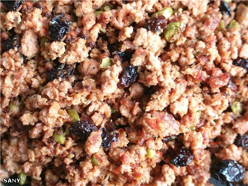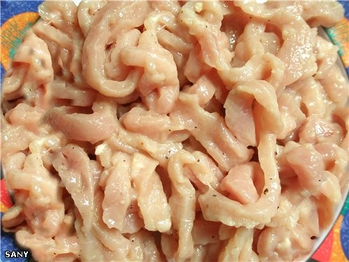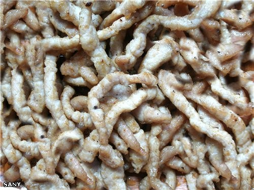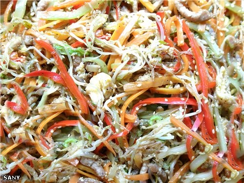 ![]() Вегетарианцы могут приготовить его без мяса и яиц. 5 ст. отварного белого риса (длинные зернышки) 500 г свиной вырезки (lomo de cerdo). Кто хочет,может заменить на куриное мясо порезанное на тонкие полосочки. 3 яйца Китайская капуста (приблизительно 200 г) 250 г шампиньонов 250 г побегов сои (если найдете) 2 средних сладких красных перца 2 средних морковки Сельдерей (стебли). В порезанном виде должны равняться количеству перца и морковки. Кунжутные семечки 1 ч.л кунжутного масла 0,5 ст соевого соуса 1 ч.л бальзамического уксуса - Свиную вырезку нарезать очень тоненько на полосочки.Лучше всего нарезать, когда мясо полумороженное: нарезается очень тонко совсем легко. ![]() Я замачиваю уже нарезанную свинину на ночь в пиве с маленьким кусочком киви,которое разминаю в пюре + соль, толченый чеснок, черный молотый перец, несколько веточек киндзы или петрушки. Это делает мясо необыкновенно нежным и мягким при жарке. - Все овощи нарезать хулианой (тонкие полосочки).Не забудьте хорошенько очистить стебли сельдерея от волокон перед нарезанием. ![]() |