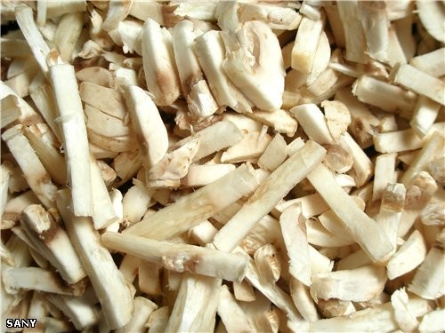 Грибы (шампиньоны) прекрасно режутся яйцерезкой (один раз обычно, потом их поворачиваете и надавливаете еще раз, ну вобщем как режете яйца на оливье). Должны получиться вот такие брусочки