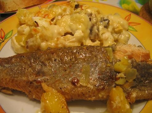 К завтраку!!! Ну ты даёшь! молодец! У меня всегда вызывают уважение хозяйки, которые могут ТАКИЕ штучки к завтраку подавать!!! Респект! А у нас на ужин была сегодня "Рыбка по-монастырски". Купили сегодня в магазине рыбу, макрель, не знала чего из нее сделать, но в подсознании было нечто мягенькое, нежное, запеченое. Кароч, пришла домой, открыла книжку и нашла сразу "свой" рецепт. Это было ооочень вкусно! Простите мою нескромность ![]() А так это выглядело на тарелке ![]() и салатик с моцареллой ![]() |