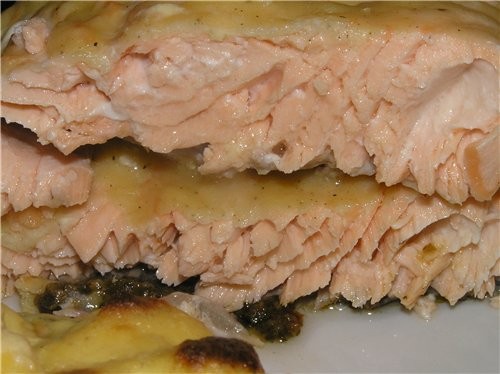 [b]В этом варианте рыба получается сочной, а не сухой. Можно использовать форель, семгу и т.д. Муж ел и говорил - Это лосось ? Очень всем понравилось. Фотка с моей тарелки, т.к. всем не хотелось ждать пока я нафоткаю. Филе лосося вместе с шкуркой, весом 500г., я использовала цельной тушкой, т.е. 1/2 от целой рыбы. В миске смешать 1 яйцо, 50 мл. белого сухого вина, соль, черный перец, 1 ч.л. меда. В эту смесь выложить филе, дать постоять 20 мин. Обвалять в муке, затем в яйчной смеси. Со стороны шкурки смазать 2 ст.л. песто и выложить на противень шкуркой вниз. Запекать при 220 гр. 10 - 15 мин. ![]() |