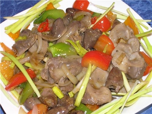 У меня в холодильнике были отварные потроха, я недолго думая приготовила салтик, деткам то, есть хочееется... если нет патрохов, думаю и любое мясо отварное мясо подойдет. Не пишу сырое, т.к. рецепт именно на быструю руку. Детки ели с рисом ( у меня оставался от вчерашнего приготовления суши и т.д. 150 г. отварных потрохов смешать с 3 видами болгарского перца ( у меня ушло по 2 колечка каждого ), 1/2 шт. рпч. лука полукольцами, 1\2 стр. острого перца красного ( можно не добавлять, кто не любит острое ). Прогреть 2 ст.л. раст. масла, высыпать нашу смесь и обжарить 30 секунд, влить по 1 ст.л. соуса терияки и рисового уксуса, соль по вкусу. Все, готово. |