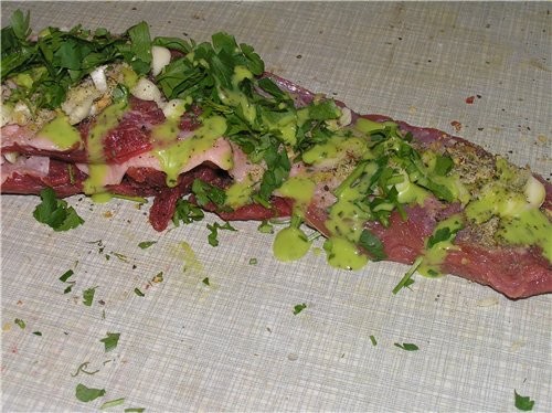 Мясо получается сочным и нежным. Запекала в рукаве для для запекания. Готовила к ужину, времени было мало, к сожаления готового мяса фото нет. Филе телятины - 1 кг. сладкая сухая паприка 1 ч.л. пучок петрушки чеснок - 3 зуб. Соль, перец по вкусу Для соуса песто: готового песто - 1,5 ст.л. сливки - 75 мл. бальзамический уксус - 1 ч.л. Нам понадобятся два куска мяса по 0,5 кг. (я использовала филе телятины, можно использовать вырезку и даже ребрышки.) Надрезать каждый кусок мяса по середине , но не до конца, посолить, посыпать свеже молотым черным перцем, частью сладкой сухой паприкой , частью петрушки, частью чеснока через пресс. Полить частью соуса песто, поверх выложить второе филе и повторить с приправами. Свернуть рулетом, полить соусом. Вложить в рукав для запекания. Запекать при 180 гр. 1 час. Время запекания зависит от вашей духовки и качестве мяса, я использовала мясо молодого теленка. ![]() ![]() |