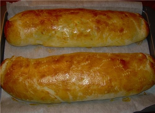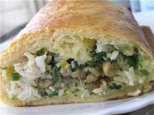 [b]Получился очень вкусный, нежный рулет, глазом не успела моргнуть закончился. Правда мы ели с друзьями. Получается два рулета. Тесто: молоко- 2 ст. дрожжи - 1п. ( 7 г. ) яйцо - 1 шт. ( используем только белок ) слив. масло - 50 г. соль - 1 ч.л. сахар - 1 ст.л. мука - 3- 3,5 ст. раст. масло - 3 ст.л. Растопить слив. масло, влить теплое молоко, добавить соль, сахар, белок, постепенно всыпать муку перемешанную с дрожжами. Замессить тесто. Влить раст. масло и хорошенько вымесить тесто. Дать подойти в течении 30 - 40 мин. Расскатать пласт , выложить начинку слоями, свернуть рулетом, смазать желтком, запекать при 170 гр. 25 - 30 мин. Начинка: 1 - обжарить 200 г. белых грибов с небольшой луковицей, соль, перец по вкусу 2 - отварной рис 1 ст., обжареное слегка филе курицы 300 г. с небольшой луковицей, добавить 1 зуб. рублен. чеснока, зелень укропа, соль, перец, 1/2 ч.л. орегано. 3 - 3 шт. оварных яйца с пучком зеленого лука 4 - обжарить шпинат 200 г. с небольшой луковицей, снять с огня, добавить 2 ст.л. сметаны, соль, перец, мускатный орех. Начинку можно сделать на ваше усмотрение любую, даже сладкую. Большую роль играет именно тесто. ![]() |