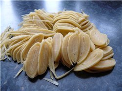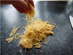 Так получается очень тонкая и длиная лапша. Это намного быстрее, т.к. у нас было принято, на похороны, свадьбы, дни рождения - на первое всегда Нудельсуп, т.е. суп с лапшой. А так как на похороны или свадьбы собиралось очень-очень много народу, то и готовить надо было много и этот способ очень продуктивный.