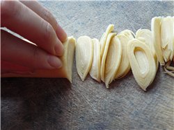 Разрезать круг на 4 части, складываем друг на дружку и сворачиваем рулетиком. Прижимаем сверху пальцами левой руки рулетик, ногти должны стоять перпендикулярно рулету и режим тонкие тонкие "улиточки", которые потом просто между пальцами протряхиваются.
