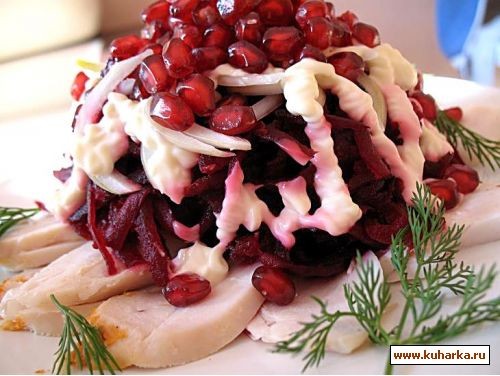 Филе грудки куриной 1 шт, гранат, лук репчатый, свекла вареная 1 шт, сок лимонный 1 ст.л., майонез, соль