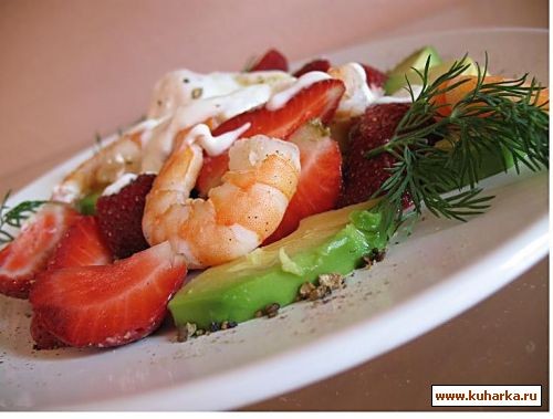 4.клубнику и авокадо соедините с креветками, полейте соусом, при подаче оформите салат листьями базилика