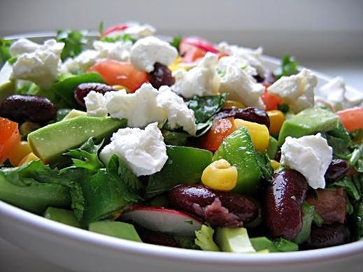 Полкочана салата айсбегр,1 банка (450)консервированной красной фасоли,1 помидор,5 редисок,5 ст.л. кукурузы, половина авокадо,1 паприка, фета или брынза по вкусу, соль ,перец
