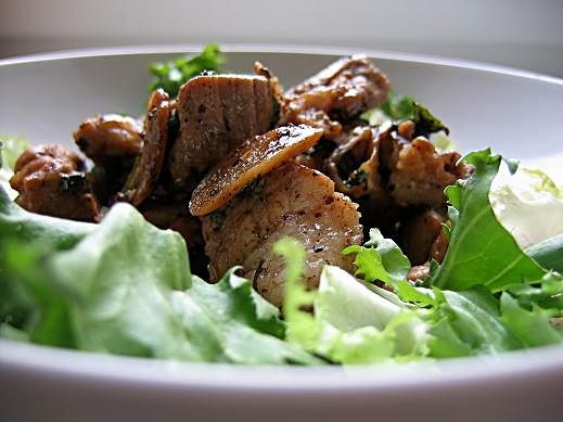 600 г постной свинины-тонкими полосками,2 ст.л. раст.масла,4 зубчика чеснока-нарезать ломтиками,1 ст.л. черного перца горошком-измельчить,4 ст.л. кинзы рубленой,1 ст.л. сахара,2 ст.л. соевого соуса,1 ст.л. лимонного сока