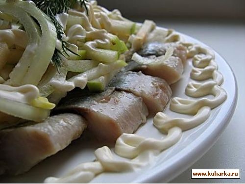 Филе семги 100г, картофель 2 шт. ,огурец соленый 1 шт., яблоко одно, горошек консервированный 4 ст.л., лук головка, майонез