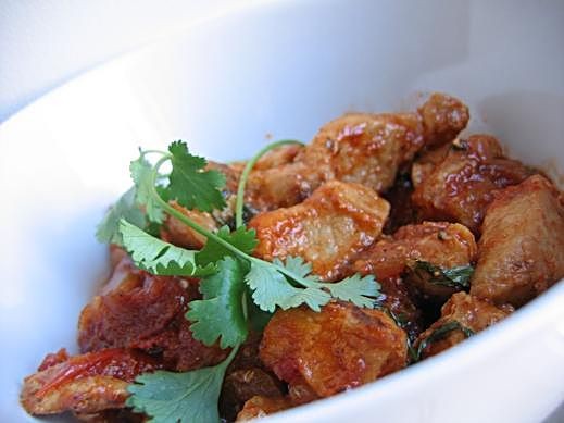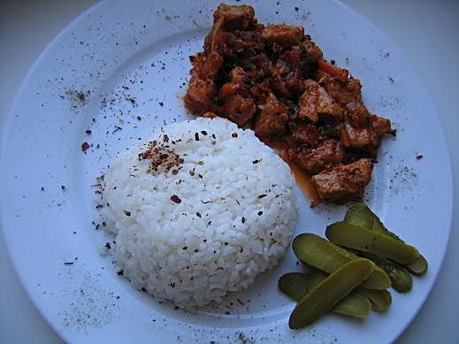 свинина,тушеная с томатами ![]() около 500 г свинины порезать кубиками-и обжарить вместе с порезанным луком и морковкой-около 10-20 минут на среднем огне,затем добавить столовую ложку томатной пасты-обжарить ее вместе с мясом(я освобождаю на сковороде местечко и там обжариваю пасту а потом перемешиваю с мясом),посолить,поперчить и добавить 2 столовые ложки помидоров в масле-я специй больше не добавляла в помидорах достаточно(можно добавить порезанный помидор и тогда специй побольше)-потушить немного,в конце добавить зелень. подавать с рисом |