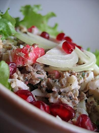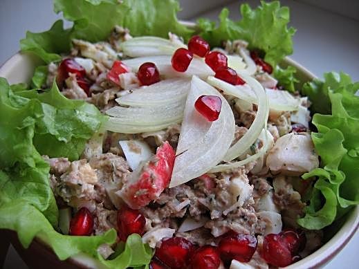 я вот начала потихоньку пробовать у меня будут в этом году гости аж на две недели-будет кому готовить и хотя как то не вяжутся у меня салаты из консервы на новогоднем столе-в любой другой праздничный день,запросто салат-закуска из крабовых палочек из журнала гастрономъ ![]() 200 г крабовых палочек,2 яйца отварить,банка консервированной рыбы в собст.соку-у меня скумбрия,50 г сыра,майонез,лук,перец,соль,листья салата,зерна граната,укроп 1.Яйца очистить и мелко порезать. 2.Рыбу измельчить вилкой, предварительно слив масло. палочки порезать 3.Яйца смешать с рыбой, майонезом и сыром, натертым на мелкой терке. Добавить лук,палочки,посолить,поперчить,добавить укроп 4.Выложить на блюдо, выстланное листьями салата. На 15 минут поставить блюдо в холодильник. Подать к столу,посыпав зернами граната |