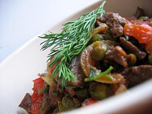 ![]() около 500 г говядины,2 большие луковицы,1 морковь,200 г замороженного горошка,1 паприка,помидор,масло раст.,перец,соль,зелень петрушки укропа и кинзы мясо порезать тонкими брусочками,поставить на средний огонь и тушить в собственном соку 40-45 минутс закрытой крышкой,посолить поперчить,добавить к мясу замороженный горошек-тушить 3-5 минут,затем( с открытой крышкой )масло и все порезанные овощи,кроме помидора-жарить 10-15 минут,помидор порезать добавить к мясу вместе с зеленью,закрыть крышку и потушить на медленном огне 3-4 минуты. примечания вкусненько,горошек и перец такую приятную сладость придают,подавать с любым гарниром |