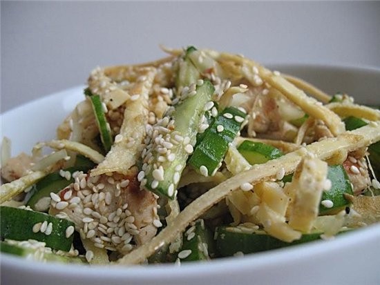 Салат из свежих огурцов с куриным мясом ![]() 2 огурца, куриная грудка, лук зеленый, 2 зубчика чеснока, соль, 1 ч.л. соевого соуса, 1ч.л. уксуса, раст. масло, 1ч.л. кунжутного семени, черный перец, 1ч.л. сахара, 1 яйцо. 1.грудку порезать тонко и обжарить до готовности,посолить(можно добавить 1ч.л.приправы для корейских салатов) 2. яйцо тщательно взбить и зажарить в виде блинчика ,затем порезать очень тонко 3. огурцы нарезать полумесяцами 4.соединить курицу с огурцами, добавить нашинкованный зеленыйлук, чеснок, уксус, сахар , соевый соус, соль, жареное кунжутное семя. все тщательно перемешать. готовое блюдо поставить на час в холодильник. 5.перед подачей на стол украсить тонко нарезанной яичной лапшой,подавать в холодном виде |