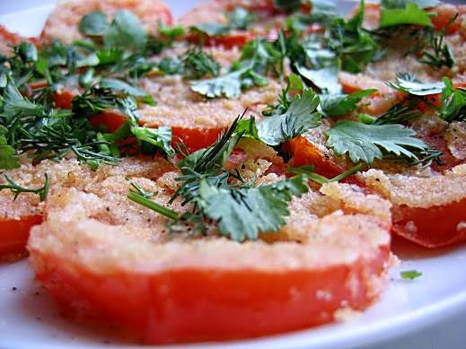 журнал "Школа гастронома" ![]() (2 порции) 2 больших помидора 0,25 ч. л. соли щепотка свежемолотого черного перца 1 зубчик чеснока 2 ст. л. манной крупы мелкого помола растительное масло для обжаривания зелень петрушки, кинзы и укропа 1. Чеснок очистить. Манную крупу просеять на тарелку. Натереть чеснок и перемешать с манкой. 2. Помидоры вымыть, обсушить, нарезать кружками толщиной 0,7 см и присыпать солью и перцем. Обвалять кружки помидоров в манной крупе. 3. Разогреть в сковороде растительное масло. Обжарить помидоры по 1,5 мин. с каждой стороны. Перед подачей на стол присыпать нарезанной зеленью. Примечания-очень вкусно с черным хлебушком,нейтральный вкус помидор можно украсить или итальским набором трав,или грузинским-и кинза к нему подходит. |