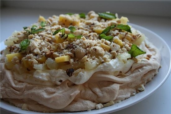 торт Павлова ![]() 4 белка,1 стакан сахарной пудры,3 ч.л. кукурузного крахмала,1 ч.л. винного уксуса,550 мл сливок для взбивания,для украшения-или ананас,клубника,банан,манго и орехи-зависит от наличия и вкуса 1.взбить белки,постепенно добавляя просеянную сахарную пудру,крахмал и уксус,взбивать около 10 минут ![]() 2.противень застелить пергаментом,начертить на нем круг диаметром 20 см,выложить белковую смесь,вилкой взбить края-масса должна напоминать балетную пачку(оказывается богатая история у этого торта) 3.разогреть духовку до 150 градусов,выпекать 40 минут,дать остыть в духовке с открытой дверцей. 4.сливки взбить-и выложить на безе,украсить фруктами нарезанными,орехами примечания-нежнейшее суфле,корочка у безе твердая а внутри мягкость и сливки и манго и ананас (я с ними делала)-все так прекрасно связалось!очень вкусный,но такой нежный что в следующий раз испеку несколько маленьких Павлова ![]() немного истории нашла на кукинге " Этот рецепт прибыл от Энн Кросер, жены винодела из Петалумы, Брайена Кросера.История началась задолго до создания этого блюда, в 1929 году, когда русская балерина Анна Павлова приехала в Перт, в Западной Австралии. Это было турне из пятнадцати выступлений.Блюдо создано Гербертом Сачсом, австралийцем из Barossa Долины, 1896 года рождения, по происхождению немцем.Он посвятил себя кулинарному искусству после Депрессии 1930-ых, сумел убедил всех, что " люди должны есть, не смотря на обстоятельства ". Сачс был фермером ( выращивал зерно), но в течение Депрессии, он стал поваром для группы овцеводческих ферм Западной Австралии. Он использовал любую возможность работать в гостиницах, которые в то время не только предлагали жилье, но и имели лучшие рестораны в стране. Он работал помощником у самых прекрасных поваров, с которыми его сводила судьба, и, наконец, получил желанную работу повара гостиницы. В начале 1930-ых он работал в гостинице Эспланады в Перте.Анна Павлова останавливалась здесь в 1929, и это было одно из наиболее важных событий в городе. В течение того периода Пертские гостиницы наслаждались золотым дождем, который был вызван интересом к балету.Несколько лет спустя после посещения Павловой госпожа Пакстон, владелица гостиницы, попросила Сачса изобрести специальное блюдо. После различных экспериментов он представил свое создание , увидев которое, она воскликнула: "Это - как свет как... Павлова! "Блюдо было первоначально украшено плодом страсти и затем плодами киви, но в настоящее время используется клубника. " |