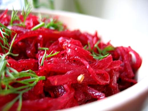Свекла по-корейски журнал "Школа гастронома" ![]() на 10 порций: 500 г свеклы 3 зубчика чеснока 0,5 ч. л. красного перца 1 ч. л. молотого кориандра 100 мл растительного масла 70 мл уксуса 0,5 ч. л. глютамата натрия соль по вкусу 1. Свеклу вымыть, очистить и натереть на терке тонкой соломкой или нарезать тонкими длинными брусочками. Сложить в миску. 2. Чеснок очистить и мелко нашинковать. Добавить в свеклу чеснок, уксус и соль. Тщательно перемешать. 3. Поставить миску со свеклой на водяную баню. Помешивая время от времени, готовить 20 мин. Снять с огня. Добавить перец, кориандр и глютамат натрия. 4. Рафинированное растительное масло довести до кипения, но не кипятить. Залить им свеклу. Перемешать и оставить под гнетом на 12 ч. примечания-вкусно!под гнет я не ставила-охладила и так слопали...вместо кориандра я положила 2 ч.л. приправ для корейских салатов и перца 1ч.л.,да еще уксус у меня 9%,но я сильно разбавила его водой-уксус лейте по своему вкусу-уж лучше не совсем похоже на корейскую закуску ,чем есть не будут кислое |