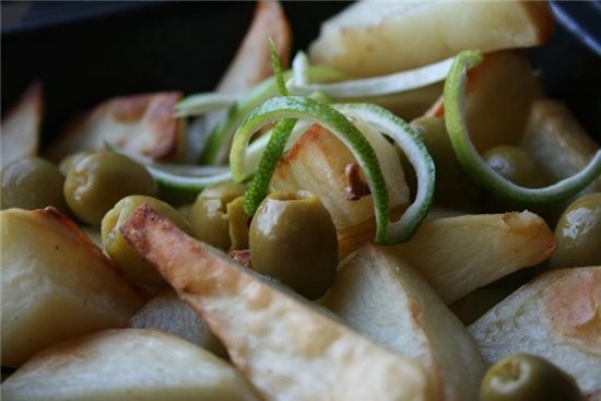 ![]() 1 лимон,1 кг молодого картофеля,2 зубчика чеснока,50 г оливок без косточек,оливковое масло,соль,черный перец,2 ст.л. сливочного масла 1.картофель разрезать на четвертинки-полить соком половины лимона,оставшийся мелко нарезать,добавить к картофелю и мелко порезанный чеснок,соль,перец,оливковое масло,выложить все в неглубокую форму,сверху разложить кусочки сливочного масла 2.разогреть духовку до 200 градусов,запекать 25-30 минут,перед подачей посыпать оливками примечания у меня как говорится молодая была не молода |