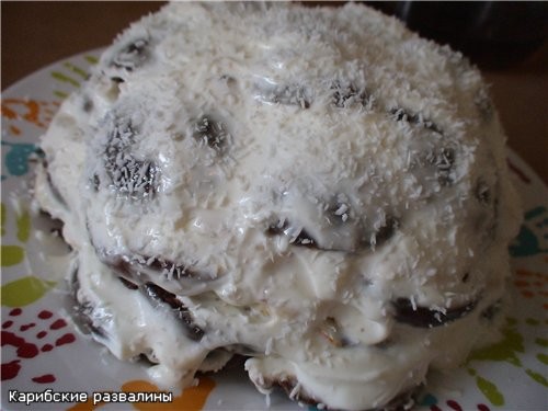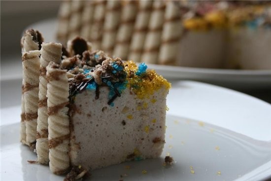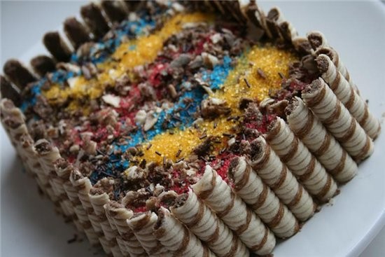 торт банановый рай ![]() 1 л сметаны,1 стакан сахара,5 бананов,20 г желатина,500 г вафельных трубочек 1.желатин залить водой около 50 мл,затем растопить на водяной бане 2.бананы очистить и измельчить в блендере,добавить сметану и сахар-взбить венчиком и под лопасти аккуратно влить желатин и тчательно перемешать 3.выложить крем в высокую форму и поставить холодильник на 4-5 часов 4.когда торт застынет,окунуть форму в горячую воду на 3 минуты и аккуратно перевернуть на блюдо 5.обложить торт трубочками и поставить на 30 минут в холодильник,украсить по желанию примечание- трубочки у меня уж так крошились и дочка захотела сама их делать-так что неровные они не из-за меня ![]() |