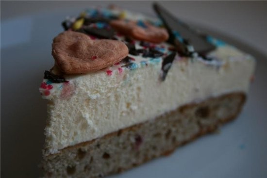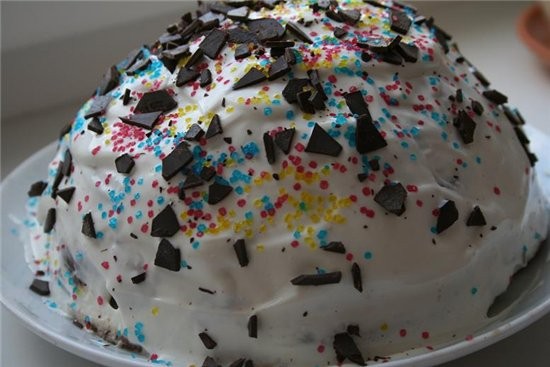 ![]() 1,5 стакана муки 1/2 стакана сахара 3 яйца 50 г сливочного масла 1/3 смородиного варенья 1/2 ч.л. соды 1/4 ч.л. столового уксуса для крема 1 кг творога 1 стакан сливок 1 стакан сахара 1 ст.л. желатина для украшения различные фигурки,шоколад 1.для теста взбить яйца,понемногу добавляя сахар,затем добавить размягченное сливочное масло,перемешать,соду загасить уксусом,ввести в массу,продолжая мешать ввести варенье,в полученную массу всыпать муку-тесто должно получиться как густая сметана-выложить его в смазанную форму от 21 до 26 см в диаметре и выпекать около 25-30 минут при 180 градусах 2.для крема сливки взбить с сахаром,творог взбить отдельно и соединить 3.желатин распустить в 1/4 стакана воды-растворить на водяной бане-добавить в полученную смесь и размешать если крем получился жидким добавить творог 4.на готовый корж выложить крем(можно сделать высокие бортики из бумаги или фольги) 5.поставить торт на 2-3 часа в холодильник и оформить ![]() ![]() примечания у меня творога было 700 ,желатин не добавляла,форма 26 см |