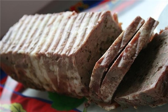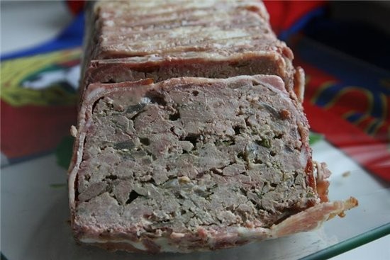 ![]() 200 г нарезанной свиной грудинки 1 луковица 6 зубчиков чеснока 450 г свиного фарша 400 г куриной печенки 2 яйца 1 пучок петрушки соль,перец по вкусу 1.прямоугольную форму для запекания с высокими бортиками выстлать полосками свиной грудинки так,чтобы были закрыты дно и борта,а концы полосок свешивались наружу 2.в сковороде растопить столовую ложку сливочного масла и обжарить порезанные мелко лук и чеснок на небольшом огне 7 минут 2.куриную печенку вымыть,мелко порубить,петрушку измельчить,яйца слегка взбить,свиной фарш выложить в большую миску-добавить лук с чесноком,печенку,яйца и петрушку-приправить солью перцем и тчательно перемешать 3.выложить смесь в подготовленную форму и хорошо утрамбовать 4.накрыть свободными краями полосок грудинки-если длины ее не хватило прикрыть полосками грудинки,нарезанными по длине накрыть форму фольгой,поставить на противень с высокими бортиками,наполовину наполненный водой-запекать 1,5 часа в духовке при 180 градусах вынуть из духовки,дать остыть до комнатной температуры,аккуратно слить вытопившийся жир,затем поставить в холодильник на ночь 5.при подаче переложить паштет на блюдо и нарезать порционно примечания ну очень вкусный-отлично держит форму и режится,правда трудно найти длинную грудинку-самый длинный мне пополся бекон,и через полтора часа готовки мне показалось-что слишком красноватый сок-вроде как недожаренный я еще на 30 минут увеличила время |