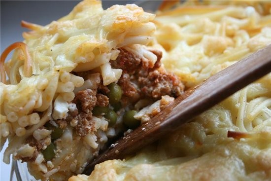 несу запеканку такую простую и такую вкусную,впрочем как все макаронные запеканки у меня их очень хорошо кушают... макароны с горошком,фаршем в сливочно томатном соусе ![]() 400 г макарон,500 г фарша,банка горошка,200 мл сливок нежирных,3 яйца,100 г тертого сыра,соль,раст.масло,молотый черный перец,1 зубчик чеснока,1 полная столовая ложка томатной пасты 1.макароны отварить 2.фарш,помешивая,обжарить в масле,добавить чеснок и томатную пасту обжарить-приправить перцем,посолить 3.сливки взбить с яйцами-посолить,поперчить 4.половину макарон выложить в высокую форму,посыпать 1/3 сыра,выложить горошек и фарш,выложить оставшиеся макароны ,посыпать сыром и полить сливочной смесью 5.запекать 35 минут при 180 градусах примечания казалось бы чего проще |