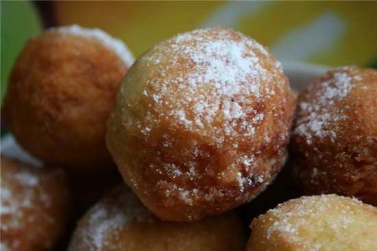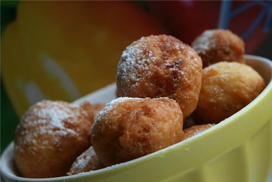 ![]() (17-20 шт) 2 ст. л. творога 1 стакан муки 2 яйца 3–4 ст. л. сахара 0,5 ч. л. соды 1 ч. л. ванильного сахара растительное масло для фритюра сахарная пудра для посыпки 1.Из указанных ингредиентов, кроме масла и сахарной пудры, замесить тесто. 2.Масло разогреть во фритюрнице. Отщипнув от теста руками,смоченными раст.маслом небольшие кусочки величиной с оливку, придать им круглую форму и бросить в кипящее масло. Когда пончики жарятся, они увеличиваются в объеме. Жарить пончики очень быстро, до тех пор, пока не подрумянятся со всех сторон. 3.Подавать, посыпав сахарной пудрой. ![]() |