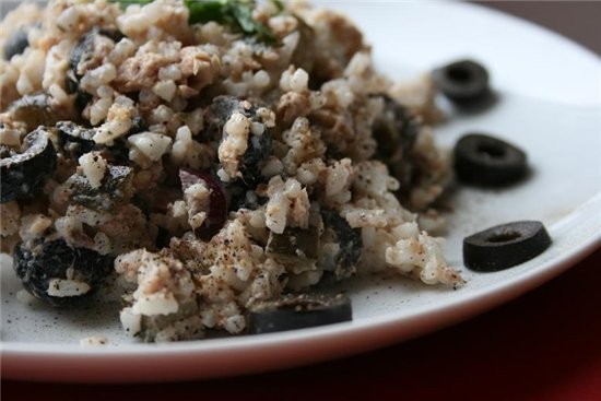 ![]() банка рыбной консервы в собственном соку 100 г маслин 150 г отварного риса 150 г соленых огурцов луковица 2 отварных яйца раст.масло,соль,перец,зелень 1.рыбу размять вилкой 2.маслины,яйца,огурцы и лук порезать мелко 3.все перемешать,посолить,поперчить,заправить маслом,посыпать зеленью примечания брала сайру в масле,поэтому больше масла не добавляла |