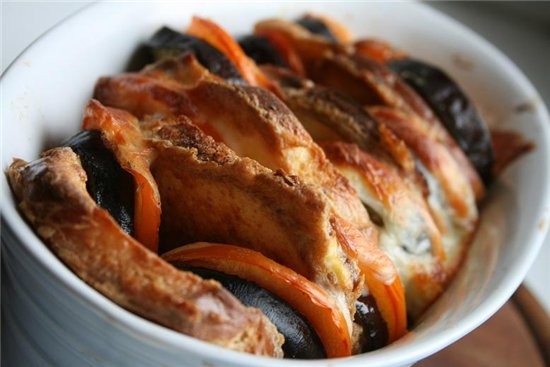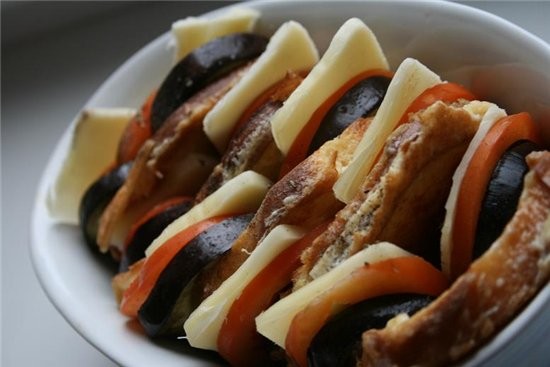 источник: журнал "Школа гастронома" ![]() ![]() (4 порции) 1 баклажан 2 помидора 100 г российского сыра или эмменталя 1 батон-багет 2 яйца по 4 веточки петрушки и укропа соль, перец по вкусу растительное масло 1. Баклажан и помидоры вымыть, нарезать кружками одинаковой толщины. Раскалить сковороду, быстро обжарить в небольшом количестве растительного масла кружки баклажана, по 1 мин. с каждой стороны. 2. Зелень вымыть, обсушить и измельчить. Взбить в миске яйца с зеленью и щепоткой соли. Хлеб нарезать кусками толщиной 1 см. Разогреть в сковороде масло. Куски хлеба обмакивать в яичную смесь и жарить на сковороде до румяной корочки, по 1,5 мин. с каждой стороны. 3. Разогреть духовку до 180ºС. На каждый кусочек хлеба положить по кружку помидора, затем кусок сыра и кружок баклажана. Сбрызнуть маслом и запекать 7 мин. Перед подачей посыпать мелкорубленой зеленью примечания-отличная закуска,у меня была на завтрак и поэтому для быстроты и удобства сделала общую запеканку в форме,а не выкладывала каждую башенку отдельно,если вы делаете башенкой то хлеб лучше нарезать кружочками по размеру баклажана и помидора,сыр брала моццареллу |