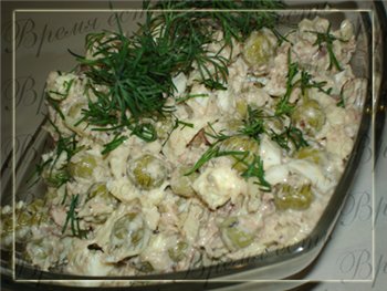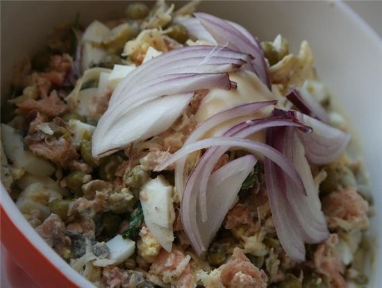 салат рыбный с горошком ![]() банка консервы в собственном соку банка горошка 150 г твердого сыра 2 вареных яйца луковица майонез,соль,перец,зелень 1.консерву размять вилкой,покрошить мелко яйца и луковицу,сыр потереть на терке-приправить,посолить и заправить майонезом примечания я брала горбушу |