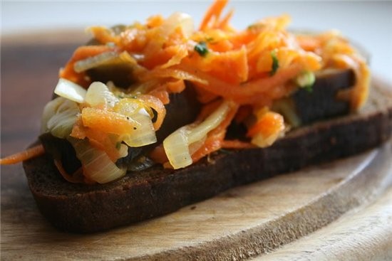 по мотивам рецепта Алисы с Карининого форума ![]() 2 больших баклажана 2 головки репчатого лукa 2 моркови 2 зубчика чеснока Маринад 1 ст. л. меда 125 мл растительного масла 3 ст. л. уксуса рубленая зелень, соль, перец по вкусу 1.Порезать баклажаны на кружочки и забланшировать в соленой воде 5 мин. Выложить в дypшлаг и дать стечь воде 2.Потерть морковь на терке, порезать лук кольцами Прижарить овощи на растительном масле, остудить 3.Добавить в овощи раздавленный чеснок, немного острого перца, соль, рубленую зелень 4.Смешать с баклажанами и залить приготовленным маринадом 5.Поставить в холодильник минимум на 3 часа примечания в оригинале еще перец 2 штуки-тоже прижарить с морковкой и луком,можно выкладывать слоями-баклажаны-овощи-получится тортик вместо меда брала чайную ложку сахара,а уксус по вкусу |