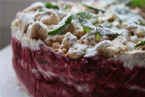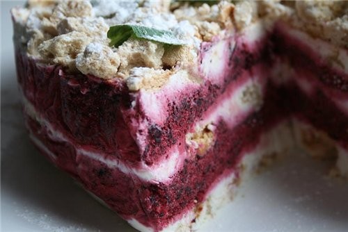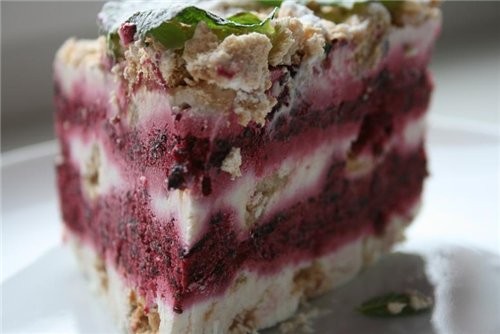 ягодный семифредо ![]() 7 белков 1 ч.л. растворимого кофе 0,75 стакана сахара 500 мл сливок для взбивания 500 г замороженных ягод 0,25 стакана сахарной пудры 1.взбить 3 белка с растворимым кофе,продолжая взбивать постепенно всыпать сахар,взбить смесь в пышную пену 2.разогреть духовку до 150 градусов,противень застелить листом пергамента,затем выложить белковую смесь слоем 2 см,запекать 1 час,вынуть из духовки и дать полностью остыть 3.сливки взбить миксером,пока они не начнут держать форму.разломать безе на маленькие кусочки.одну треть отложить,а оставшееся безе смешать со взбитыми сливками 4.ягоды предварительно разморозить и измельчить в блендере в пюре.оставшиеся белки взбить с сахарной пудрой в пышную пену и смешать с ягодами 5.форму с высокими бортиками застелить двумя слоями пищевой пленки,оставив свободные края-распределить 1/3 сливочной смеси по дну формы,сверху выложить половину ягодной смеси.повторить слои еще раз,сверху выложить последний слой взбитых сливок,посыпать оставшимися крошками безе.накрыть торт свободными концами пленки,сверху положить лист фольги.поместить в морозильную камеру минимум на 3 часа 6.вынуть,освободить от пленки,можно украсить листьями мяты ,свежими или консервированными ягодами ![]() ![]() примечания- из журнала гастроном,не сложный рецепт,форму брала 21 см в диаметре-получился до самой верхушки,если любите послаще в ягоды стоит добавить немного сахара. |